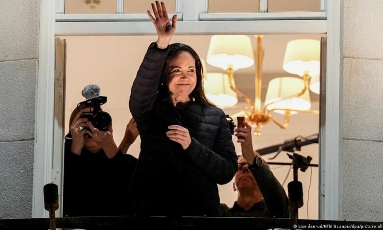 في ساعة مبكرة من صباح الخميس (10 ديسمبر/ كانون الأول 2025)، ظهرت زعيمة المعارضة الفنزويلية ماريا كورينا ماتشادو علناً لأول مرة منذ نحو عام، حيث لوحت لمؤيديها أمام فندق في العاصمة النرويجية أوسلو، بعد ساعات من تسلّم ابنتها جائزة نوبل للسلام نيابة عنها.