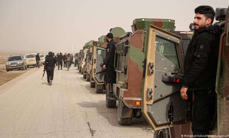 جنود سوريون يحمون قافلة تابعة لوزارة الداخلية السورية متجهة إلى مناطق الإدارة الذاتية الكرديةصورة من: Izz Aldien Alqasem/Anadolu Agency/IMAGO